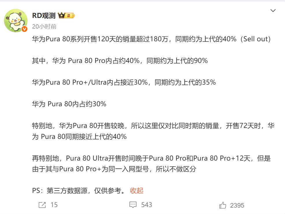 近日有博主爆出华为Pura80系列开售120总销量超过180万,其中Pro版占比最高,约为40%,Pro+和Ultra版本约占30%,标准版也约占30%,Pura80系列的销量约为上一代Pura70系列的40%。看到Pura80系列遇冷,很多人开始唱衰华为手机!我想说的是,你们根本不懂华为,华为在下一盘大棋,Pura80系列只是一个棋子,是鸿蒙发展不得不付出的代价。